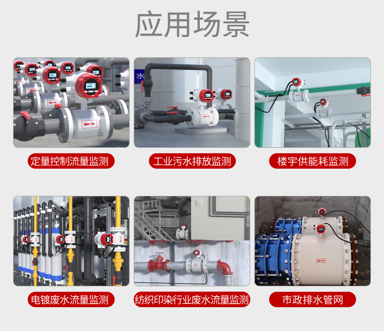 电磁流量计基于法拉第电磁感应原理设计,用于直接测量封闭管道内导电液体的瞬时流量,并具有流量累积功能。在进行现场监测显示的同时,可输出标准的电流信号、脉冲信号和 RS485 数字信号,供记录、调节、控制使用,实现检测自动控制。可广泛应用于自来水、化工、煤炭、环保、轻纺、冶金、造纸等行业。