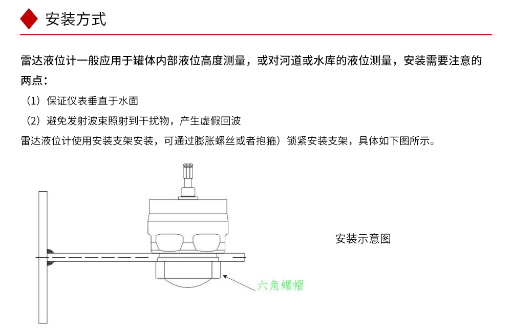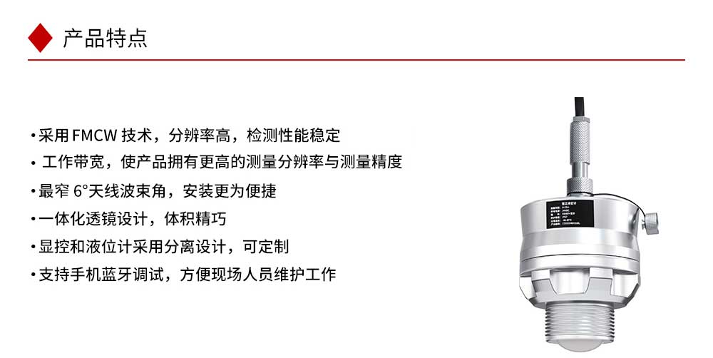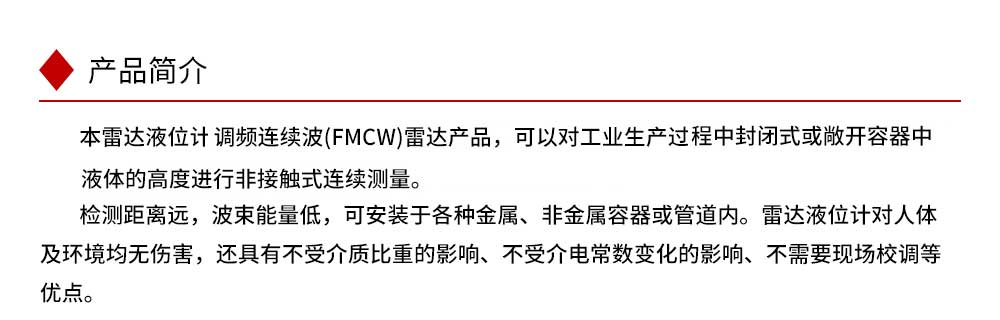 本产品波束能量低,对人体及环境均无伤害,还具有不受介质比重的影响、不受介电常数变化的影响、不需要现场校调等优点,广泛应用江河、水库、湖泊、灌渠、河道等自然水域水文监测场合。